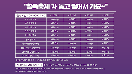 군포시는 축제 기간 동안 셔틀버스를 운영하기도 하니 공식 홈페이지 공지를 참고하세요.